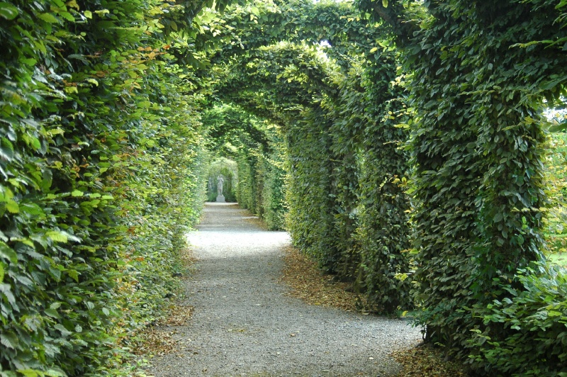 Hornbeam arches lead the eye to statuary within the formal gardens.